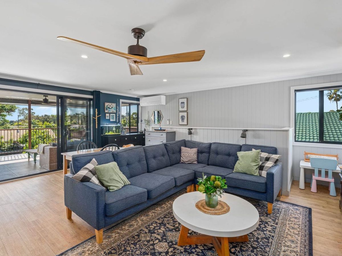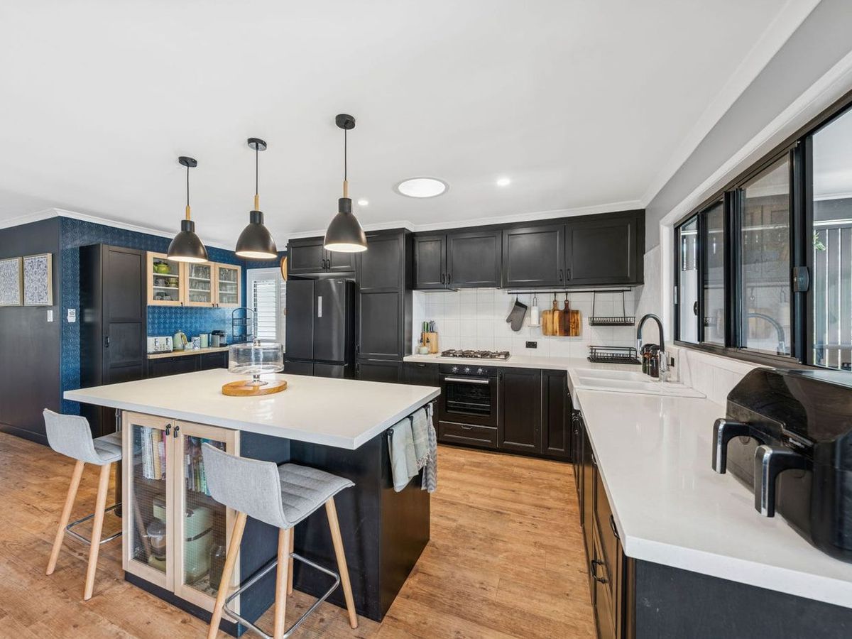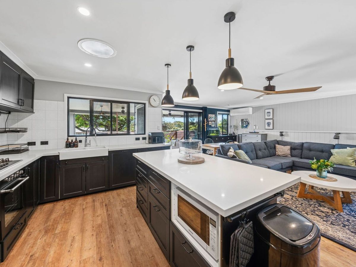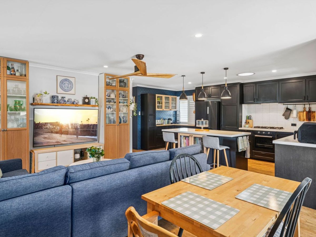 Upstairs, the open-plan living, dining, and kitchen zone is light-filled and inviting, flowing seamlessly through double-stacked sliding glass doors onto a large entertaining deck. The modern kitchen is a standout, featuring sleek cabinetry, a new oven, a 900mm gas cooktop (configured for BBQ gas bottles), and a farmhouse-style double sink perfect for family meals or entertaining guests. Split-system air conditioning and ceiling fans provide year-round comfort.