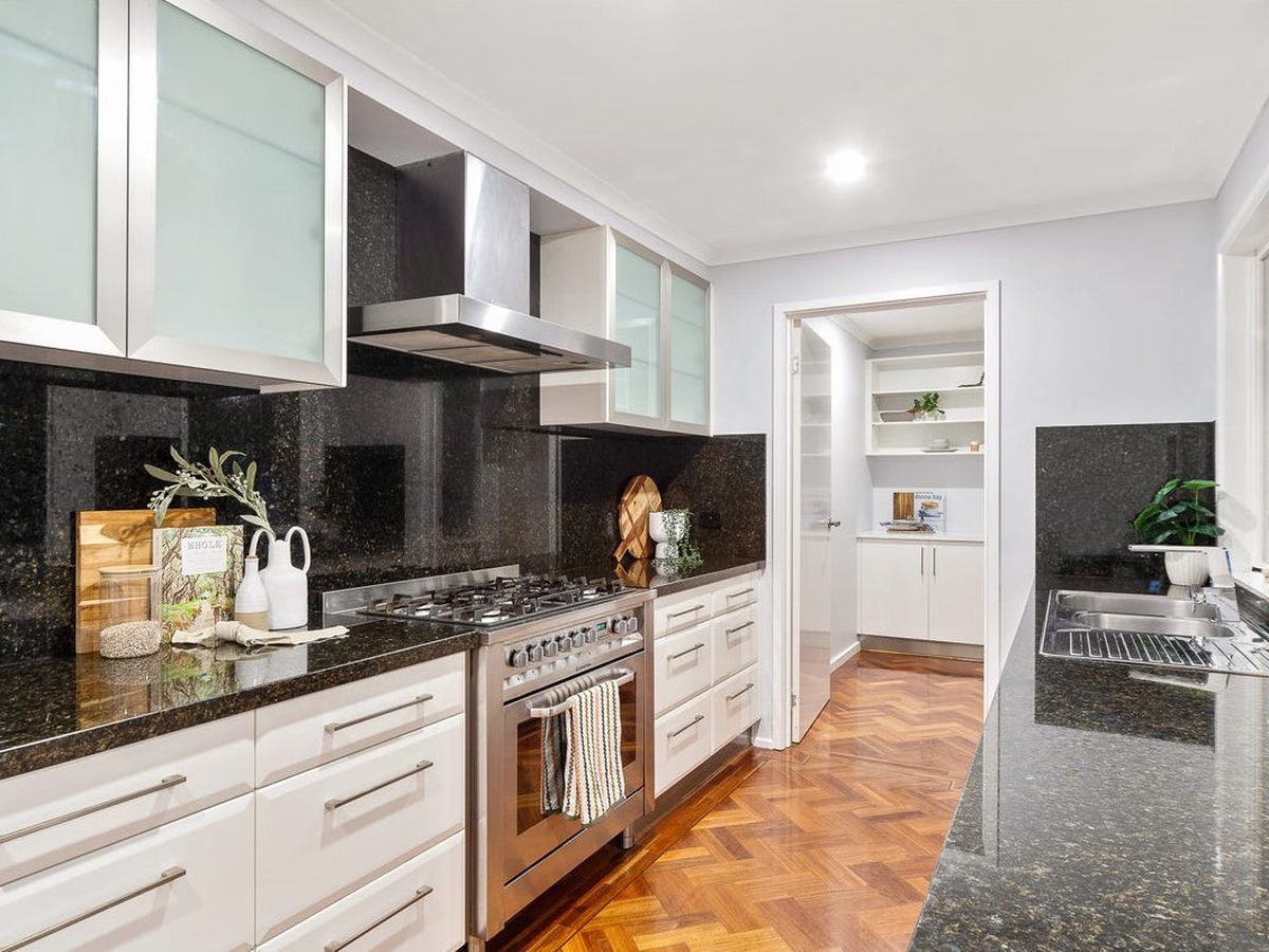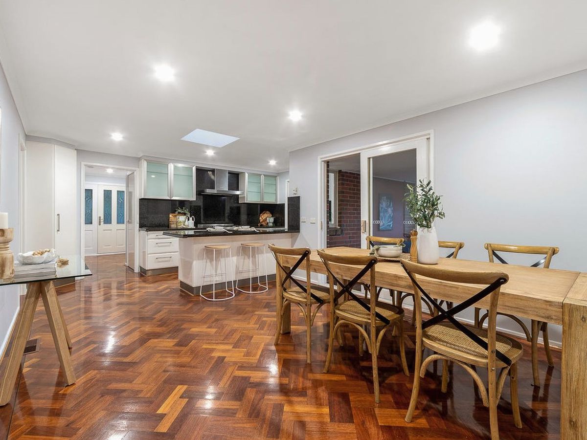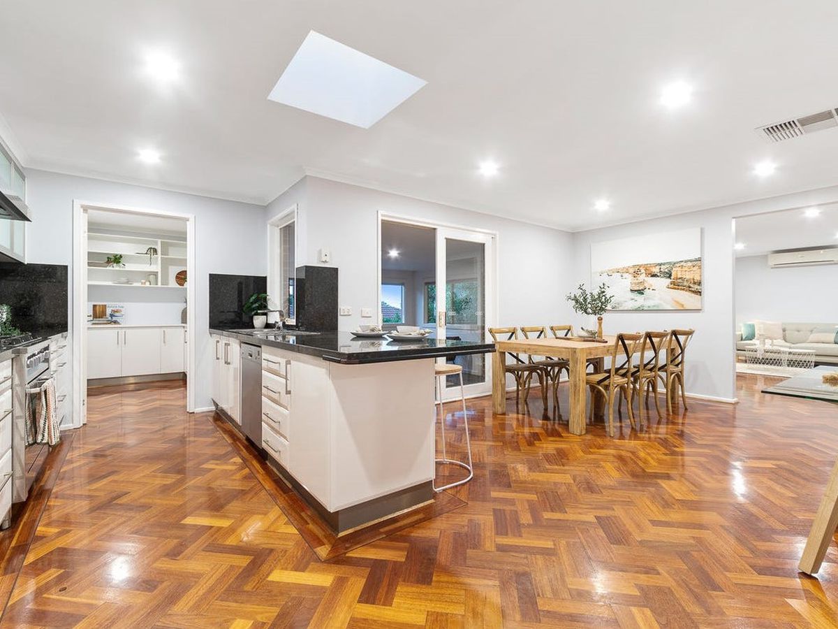 Polished herringbone timber floors flow through the recently painted interior, leading from a formal lounge to a central kitchen and dining hub. The kitchen boasts an Ariston 900mm gas cooker, Bosch dishwasher, opulent granite surfaces, and a convenient walk-in pantry, perfect for busy family life. New roller blinds are to be installed throughout, adding a fresh, modern touch.
