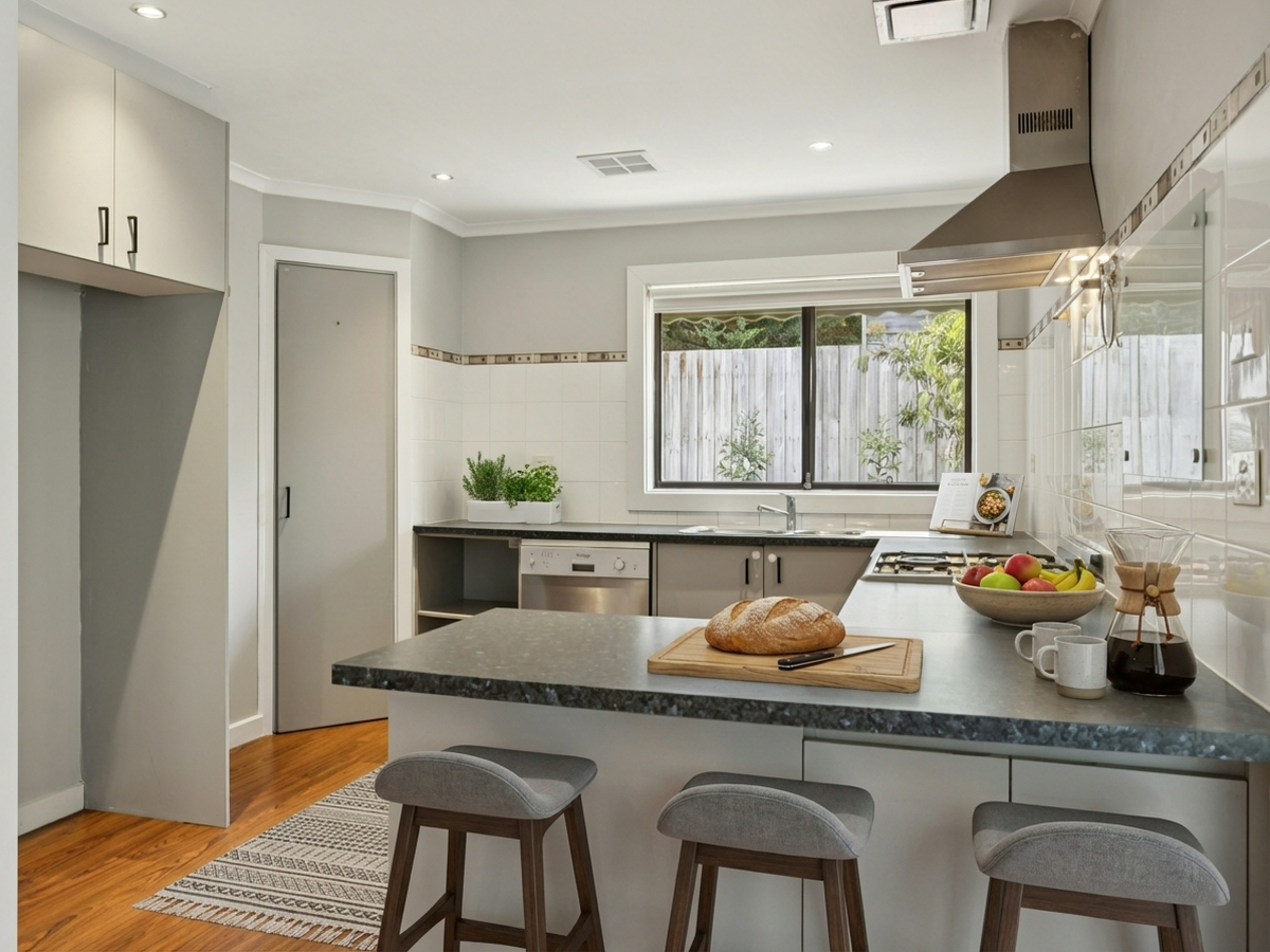 The open-plan kitchen, dining and living zone is full of natural light ideal for cooking Christmas favourites, hosting friends or unwinding after a long day. The kitchen features stainless-steel appliances, dishwasher, breakfast bar, tiled splashback and plenty of storage. Sliding doors lead to a bluestone-paved outdoor entertaining area, perfect for summer dinners or relaxing evenings. The rear yard offers established gardens and space to enjoy.