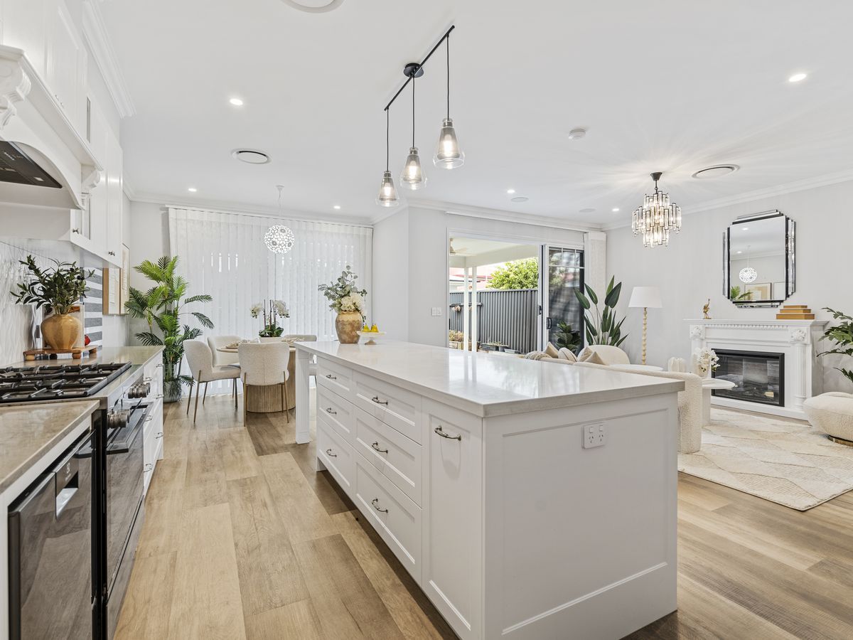 At the heart of the home is a designer kitchen featuring manufactured stone benchtops, a 90cm freestanding oven and a butlers pantry with European-style laundry. Hybrid flooring flows throughout the entire home, while full ducted air conditioning ensures year-round comfort.