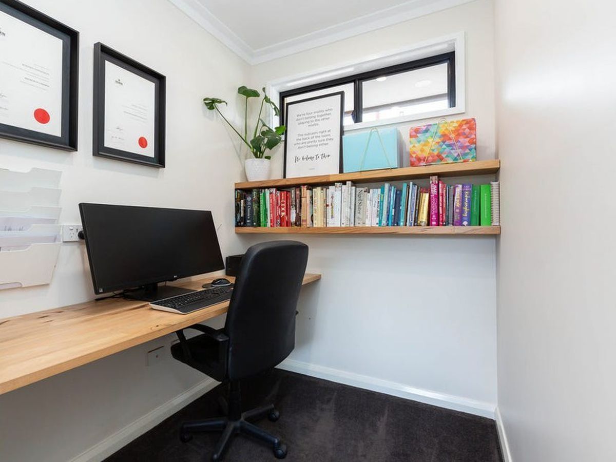 Additional features include a dedicated study with built-in bench, European-style laundry with trough and linen press, split-system heating and cooling, quality flooring throughout, LED downlights, and high ceilings that enhance the sense of space.