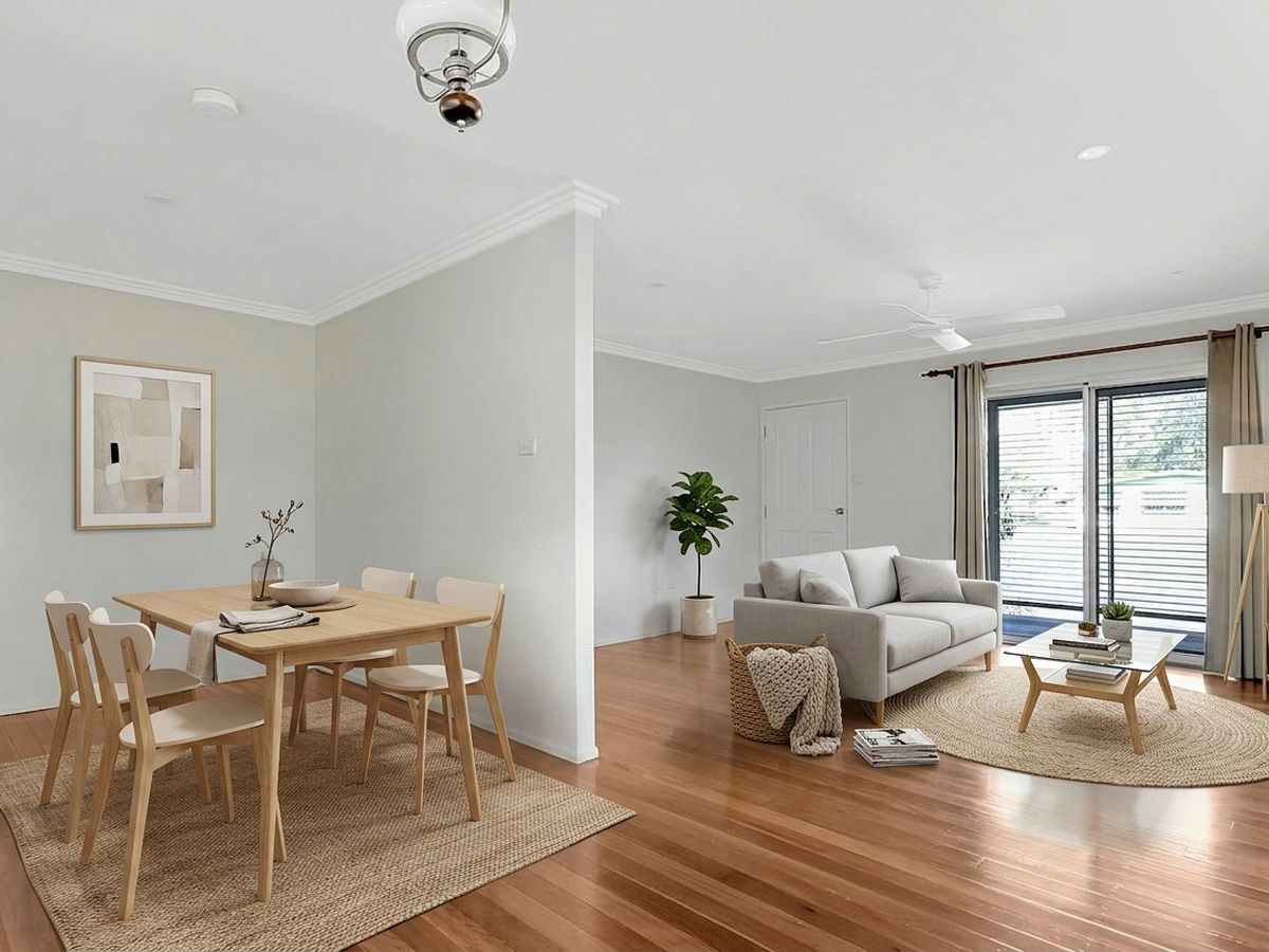 Upstairs features three well sized bedrooms, all with built-in wardrobes, a central bathroom with a separate toilet, a functional kitchen, and light filled lounge and dining areas. A rear sunroom adds additional space, perfect for relaxing or working from home.